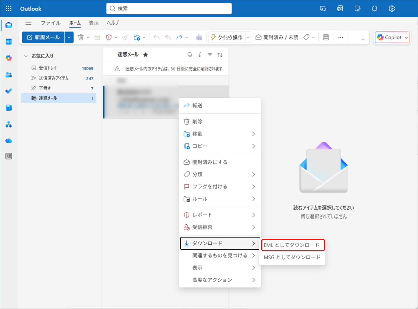 Webメール(Outlook on the web)においては 下図の手順で、メールデータを eml形式で保存してください。